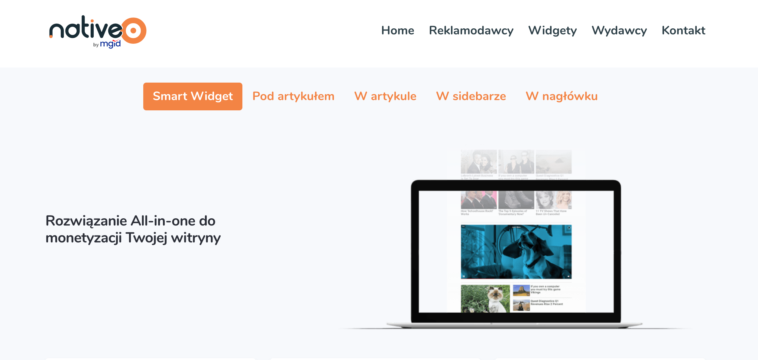 Wydawcy, dzięki współpracy z Nativeo zyskują możliwość osiągania wysokich przychodów, dzięki wykorzystywaniu angażujących formatów i współpracy z najlepszymi Reklamodawcami. Nativeo dzięki dopracowanym pod kątem UX widgetom i innowacyjnym rozwiązaniom, które mają za zadanie podnosić czas wizyty na stronie, skutecznie zwiększa liczbę odsłon reklam oraz pomaga uzyskać wysoki wskaźnik CTR z prowadzonych kampanii, a co za tym idzie zmaksymalizować przychody z monetyzacji.