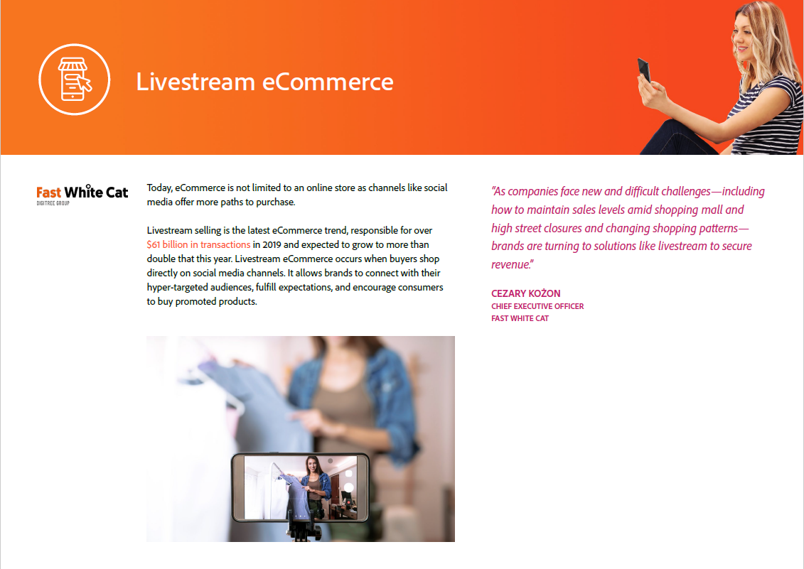 Jedną z takich okazji okazał się innowacyjny pomysł marki odzieżowej Quiosque, który firma zrealizowała we współpracy z Fast White Cat. Udało nam się wspólnie nie tylko wdrożyć rozwiązanie przenoszące sprzedaż z offline do online, ale też łączące w sobie nowoczesne podejście do zakupów z wykorzystaniem Facebooka, jako jednego z popularniejszych kanałów Social Media – w Polsce korzysta z niego aż 75% internautów. Wdrażając pomysł, jaki firma Quiosque postawiła sobie za cel, udało się stworzyć możliwość promocji i sprzedaży produktów marki na żywo – właśnie na Facebooku. W tym markę wsparło Fast White Cat. Nasza realizacja odbiła się szerokim echem na rynku, do tego stopnia, że w swoim Raporcie “Future is now”, opisała ją marka Adobe