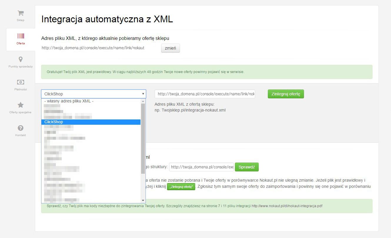 Załącznik 2. Widok integracji oferty z pliku XML w serwisie Nokaut.pl