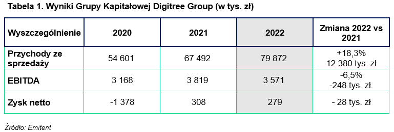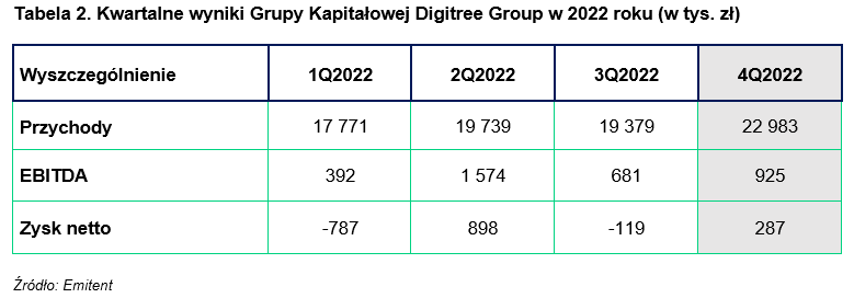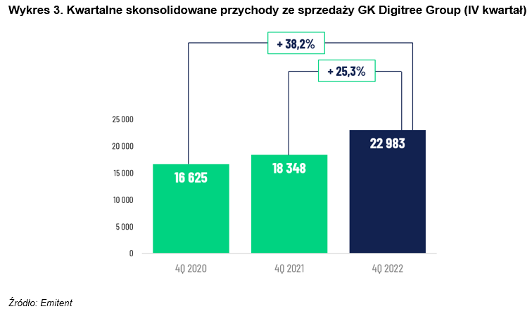 Skonsolidowane przychody Grupy Kapitałowej Digitree Group w czwartym kwartale 2022 roku wyniosły 22 983 tys. zł i były wyższe od wypracowanych w czwartym kwartale 2021 roku o 4 635 tys. zł, tj. o ponad 25 proc. oraz wyższe od przychodów osiągniętych w pozostałych kwartałach 2022 roku. Grupa w czwartym kwartale 2022 roku osiągnęła zysk netto na poziomie 287 tys. zł w porównaniu 57 tys. zł straty w tym samym okresie 2021 roku oraz 888 tys. zł straty w 2020 roku.