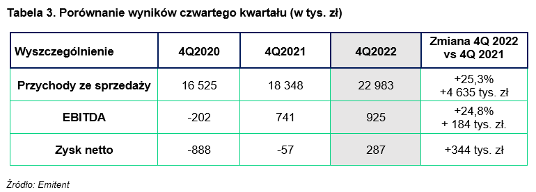 2022 rok zakończyliśmy ze wzrostem przychodów o 18,3 proc. r/r, osiągając tym samym rekordowy w swojej historii poziom sprzedaży w wysokości 79,9 mln zł. Ponadto Grupa wypracowała zysk netto na poziomie 279 tys. zł, a EBITDA zatrzymała się na 3,6 mln złotych. Przychody samego czwartego kwartału wzrosły o ponad 25% w porównaniu do 2021 roku…