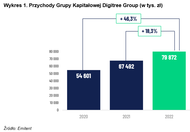 Przychody Grupy Kapitałowej Digitree Group zwiększyły się o prawie 12,4 mln zł, tj. wzrosły do poziomu niemal 79,9 mln zł. Oznacza to wzrost o 18,3 proc. w stosunku do dwunastu miesięcy 2021 roku i o ponad 46 proc. w porównaniu do analogicznego okresu 2020 roku. Grupa osiągnęła wzrost przychodów, który w głównej mierze został wypracowany w segmencie E-commerce software house.