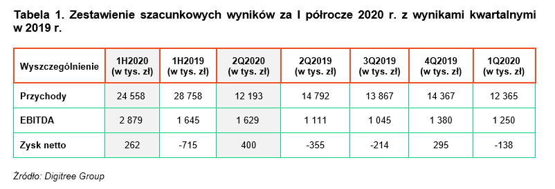 Wstępna skonsolidowana EBITDA Grupy Kapitałowej Digitree Group w pierwszym półroczu 2020 r. wyniosła ok. 2,9 mln zł, wobec 1,7 mln zł w pierwszym półroczu 2019 roku, co stanowi wzrost o kwotę 1,2 mln zł, tj. o 75% rok do roku. Wynik EBITDA osiągnięty w samym II kwartale 2020 r., wynoszący 1, 6 mln zł, okazał się najwyższy w porównaniu do 4 poprzedzających go kwartałów. Szacunkowy zysk netto w pierwszym półroczu 2020 roku wyniósł 0,3 mln zł, wobec straty (-0,7 mln zł) osiągniętej w analogicznym okresie roku 2019. Zysk netto wypracowany w samym II kwartale 2020 roku, tj. 0,4 mln zł, również stanowi znaczną poprawę względem poprzednich kwartałów.