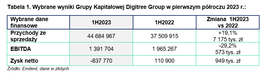 EBITDA Grupy Digitree Group w pierwszym półroczu 2023 roku wyniosła 1 392 tys. zł, wobec 1 965 tys. zł w poprzednim roku, tzn. spadła o kwotę ok. 573 tys. zł, tj. o 29,2% r/r. Skonsolidowana strata netto wyniosła w pierwszym półroczu 2023 roku ok. 838 tys. zł, podczas gdy