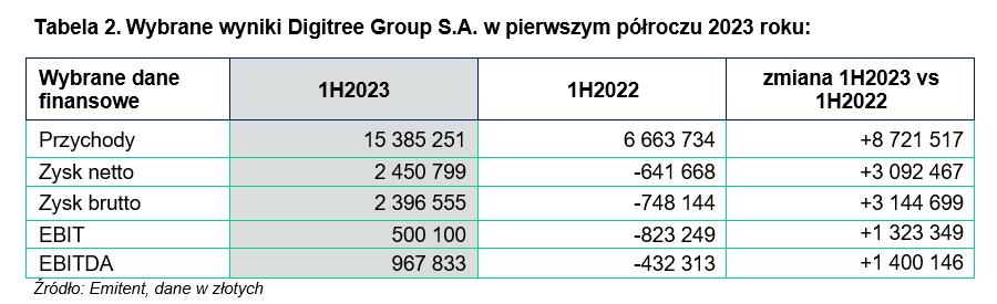 Digitree Group S.A. osiągnęła w pierwszym półroczu 2023 roku zysk netto na poziomie 2,45 mln zł, wobec ubiegłorocznej straty sięgającej 0,64 mln. zł, a także wzrost w zakresie wartości EBIT (o 1,32 mln zł, tj. do poziomu 500 tys. zł) i EBITDA (o 1,4 mln zł, tj. do poziomu 968 tys. zł).