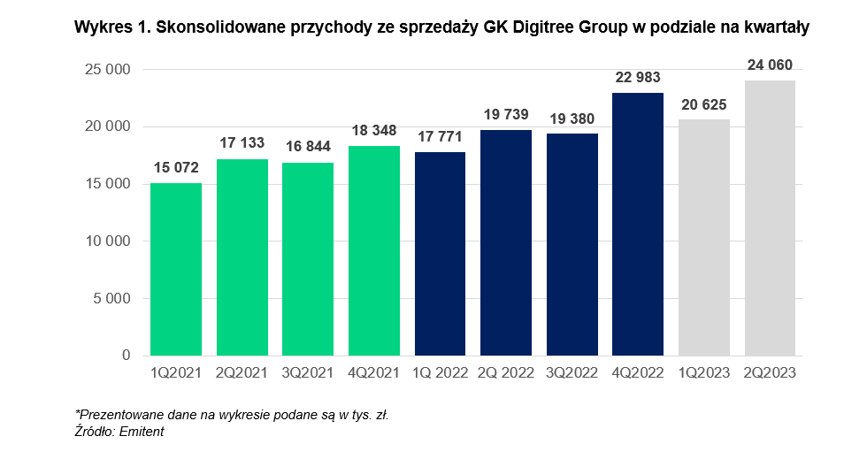 – Cieszymy się, że pomimo trudnych warunków rynkowych, w pierwszym półroczu 2023 udało nam się wypracować wyższe przychody niż w analogicznym okresie roku ubiegłego. Wciąż pracujemy nad poprawą rentowności naszego biznesu. W części już widzimy efekty poprawy efektywności kosztowej w kilku naszych segmentach. Pełny ich efekt będzie widoczny na przełomie trzeciego i czwartego kwartału. Oczywiście nie składamy również broni w zakresie dalszego rozwoju od strony sprzedaży. Wierzymy, że liczne inicjatywy podjęte na tym polu pozwolą nam dalej ją skalować, co w połączeniu z obniżoną bazą kosztową pozwoli na wygenerowanie optymalnych wyników na poziomie EBITDA i zysku netto. – komentuje Konrad Żaczek, Prezes Zarządu Digitree Group S.A.