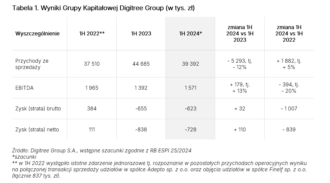 Przychody Grupy Kapitałowej Digitree Group szacunkowo osiągnęły poziom 39,4 mln zł. To spadek o 11,8 proc. w stosunku do pierwszych sześciu miesięcy 2023 roku i wzrost o 5 proc. w porównaniu do analogicznego okresu 2022 roku. Powyższe zmniejszenie skonsolidowanej sprzedaży było w głównej mierze wynikiem braku kontynuacji dodatkowego projektu, prowadzonego w ramach segmentu Agencji Digital, który w roku 2023 spowodował zauważalny wzrost przychodów, natomiast miał niewielki wpływ na poziom marży bezpośredniej i EBITDA. Ponadto, wpływ na spadek przychodów miała także mniejsza sprzedaż realizowana przez segment E-commerce Software House, co z kolei było efektem trudnych warunków rynkowych w tym obszarze.