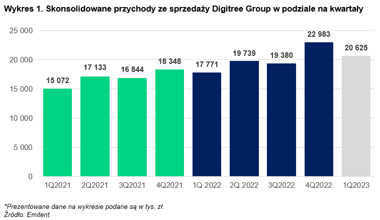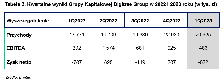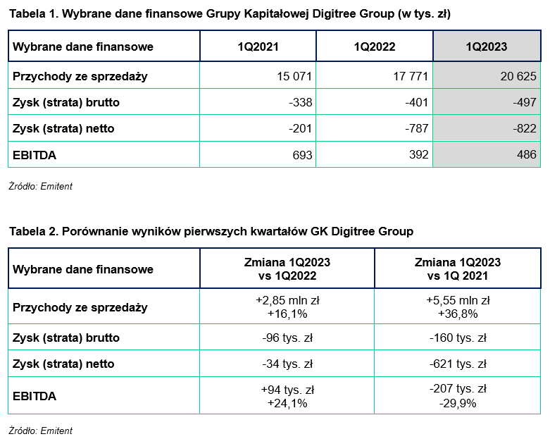 Skonsolidowane przychody Grupy Kapitałowej Digitree Group zwiększyły się w pierwszym kwartale 2023 roku o blisko 2,9 mln zł osiągając rekordowy, pod względem pierwszego kwartału, poziom 20,6 mln zł. To wzrost o ponad 16 proc. w porównaniu do analogicznego okresu ubiegłego roku. Wzrost przychodów został wypracowany głównie w segmencie Agencja Digital. Strata netto wyniosła 0,82 mln zł, wobec straty sięgającej bisko 0,79 mln zł w I kwartale 2022 roku. EBITDA w pierwszym kwartale br. wyniosła w przybliżeniu 486 tys. zł, wobec 392 tys. zł w analogicznym okresie poprzedniego roku.