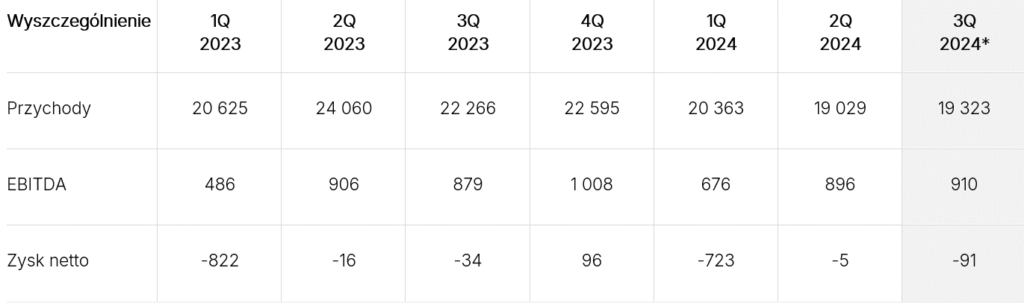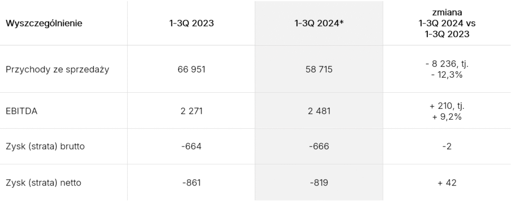 Szacunkowa strata netto Grupy wyniosła 0,82 mln zł, wobec straty sięgającej ok. 0,86 mln zł w tym samym okresie ubiegłego roku. Ponadto, szacunkowa EBITDA w trzech kwartałach 2024 roku wyniosła 2,48 mln zł, wobec niemal 2,3 mln zł w analogicznym okresie 2023 roku.